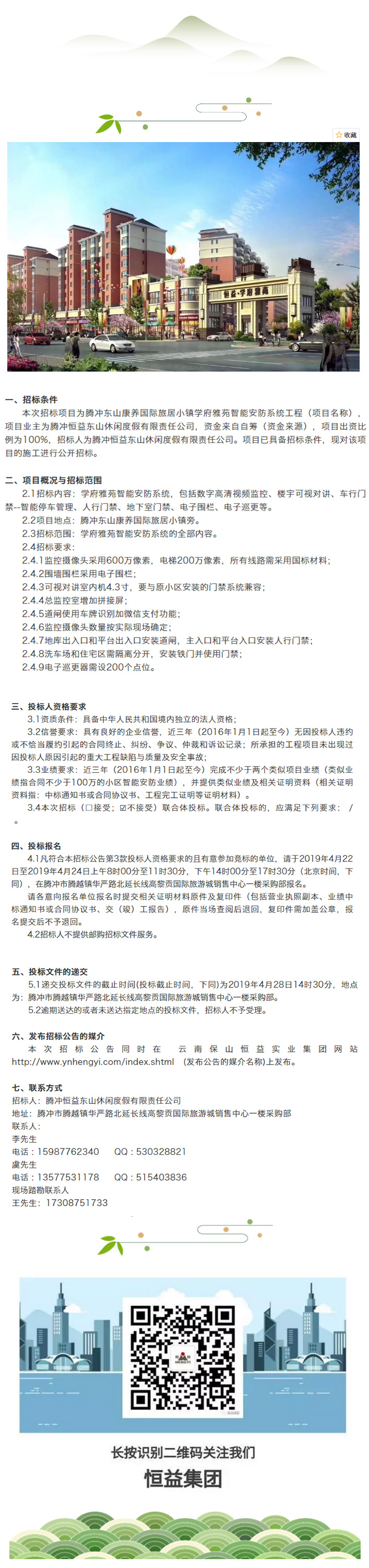 騰沖東山康養(yǎng)國(guó)際旅居小鎮(zhèn)學(xué)府雅苑智能安防系統(tǒng)工程施工招標(biāo)公告 來源: 瀏覽量:10158 日期:2019-04-22 分享到: 上一篇:騰沖市恒益礦產(chǎn)品經(jīng)貿(mào)公司關(guān)于鋅精礦競(jìng)價(jià)銷售公告(201903)號(hào) 下一篇:騰沖恒益東山農(nóng)業(yè)開發(fā)有限公司牛只采購(gòu)競(jìng)價(jià)招標(biāo)公告