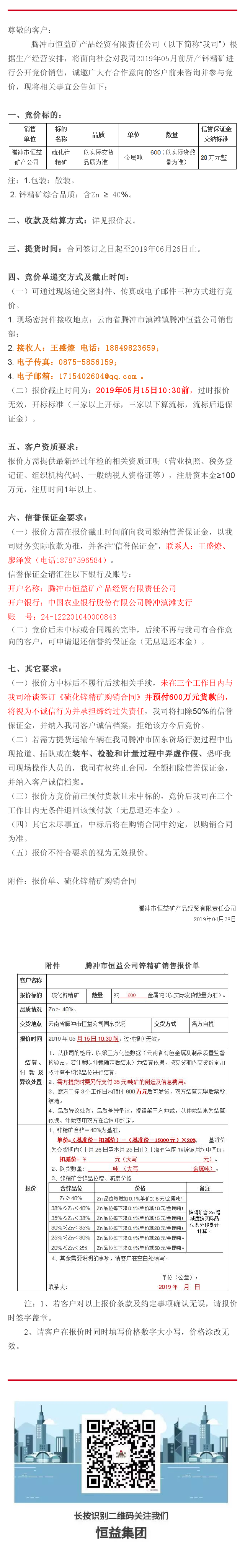 騰沖市恒益礦產(chǎn)品經(jīng)貿(mào)公司關(guān)于鋅精礦競(jìng)價(jià)銷售公告(201903)號(hào) 來(lái)源: 瀏覽量:9884 日期:2019-04-28 分享到: 上一篇:騰沖市恒益礦產(chǎn)品經(jīng)貿(mào)公司關(guān)于鋅精礦競(jìng)價(jià)銷售公告(201904)號(hào) 下一篇:騰沖東山康養(yǎng)國(guó)際旅居小鎮(zhèn)學(xué)府雅苑智能安防系統(tǒng)工程施工招標(biāo)公告