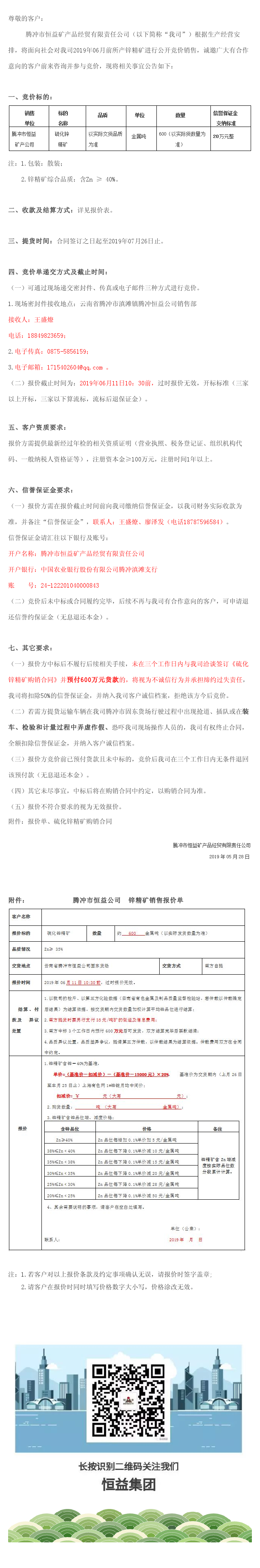 騰沖市恒益礦產(chǎn)品經(jīng)貿(mào)公司關(guān)于鋅精礦競價銷售公告(201904)號 來源: 瀏覽量:9306 日期:2019-05-28 分享到: 上一篇:高黎貢國際健康旅居小鎮(zhèn)低層住宅八組團-江山小院精裝樣板房裝修施工工程招標(biāo)公告 下一篇:騰沖市恒益礦產(chǎn)品經(jīng)貿(mào)公司關(guān)于鋅精礦競價銷售公告(201903)號