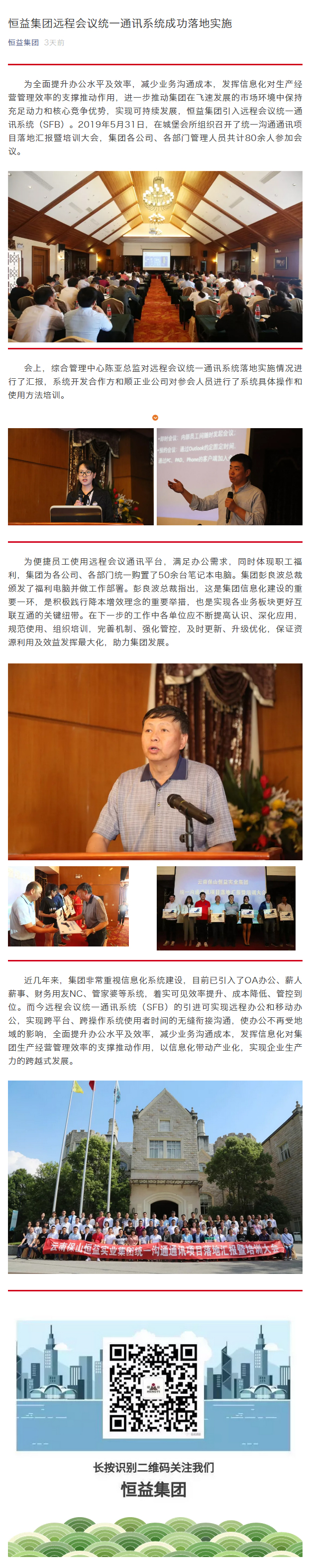 恒益集團(tuán)遠(yuǎn)程會(huì)議統(tǒng)一通訊系統(tǒng)成功落地實(shí)施 來(lái)源: 瀏覽量:7539 日期:2019-06-03 分享到: 上一篇:大理州、市領(lǐng)導(dǎo)一行參觀考察高黎貢文化創(chuàng)意產(chǎn)業(yè)園區(qū) 下一篇:恒益集團(tuán)組織召開戰(zhàn)略部署及強(qiáng)化內(nèi)部管理會(huì)議
