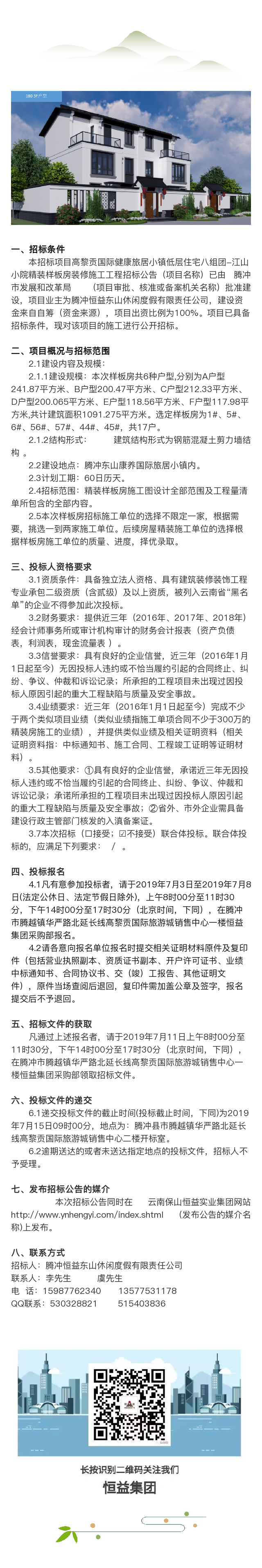 高黎貢國(guó)際健康旅居小鎮(zhèn)低層住宅八組團(tuán)-江山小院精裝樣板房裝修施工工程招標(biāo)公告 來(lái)源: 瀏覽量:10279 日期:2019-07-04 分享到: 上一篇:高黎貢國(guó)際健康旅居小鎮(zhèn)低層住宅八組團(tuán)—江山小院門(mén)頭及圍墻工程招標(biāo)公告 下一篇:騰沖市恒益礦產(chǎn)品經(jīng)貿(mào)公司關(guān)于鋅精礦競(jìng)價(jià)銷(xiāo)售公告(201904)號(hào)