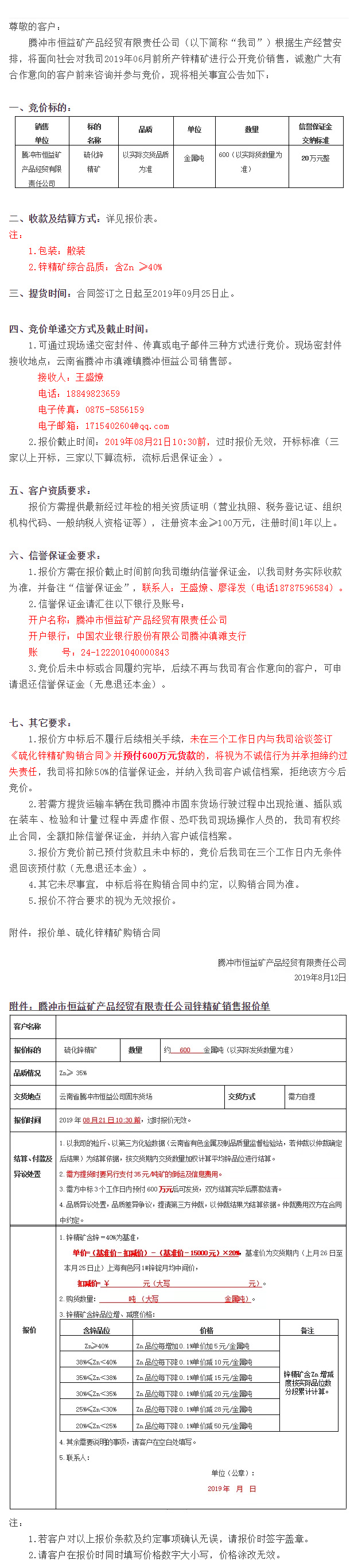 騰沖市恒益礦產(chǎn)品經(jīng)貿(mào)有限責(zé)任公司關(guān)于鋅精礦競(jìng)價(jià)銷售公告(201905)號(hào) 來源: 瀏覽量:10201 日期:2019-08-13 分享到: 上一篇:騰沖市恒益礦產(chǎn)品經(jīng)貿(mào)有限責(zé)任公司關(guān)于鋅精礦競(jìng)價(jià)銷售公告(201905)號(hào) 下一篇:高黎貢國(guó)際健康旅居小鎮(zhèn)低層住宅八組團(tuán)—江山小院門頭及圍墻工程招標(biāo)公告