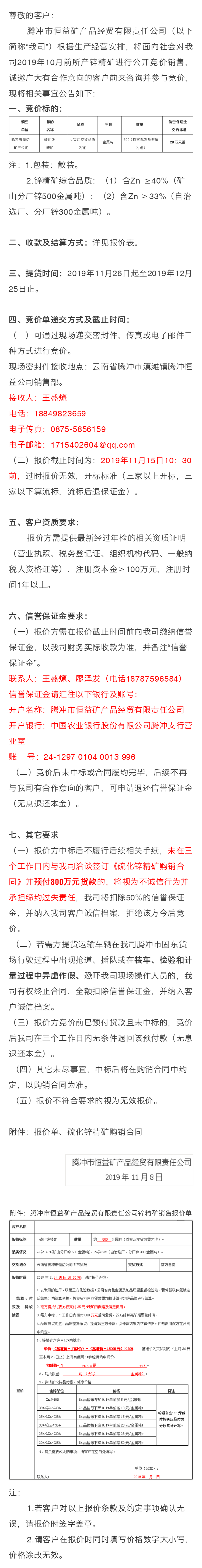 騰沖市恒益礦產(chǎn)品經(jīng)貿(mào)有限責(zé)任公司關(guān)于鋅精礦競(jìng)價(jià)銷(xiāo)售公告(201911)號(hào) 來(lái)源: 瀏覽量:10542 日期:2019-11-11 分享到: 上一篇:高黎貢國(guó)際健康旅居小鎮(zhèn)低層住宅八組團(tuán)江山小院室外市政工程施工招標(biāo)公告 下一篇:騰沖市恒益礦產(chǎn)品經(jīng)貿(mào)有限責(zé)任公司關(guān)于鋅精礦競(jìng)價(jià)銷(xiāo)售公告(201910)號(hào)