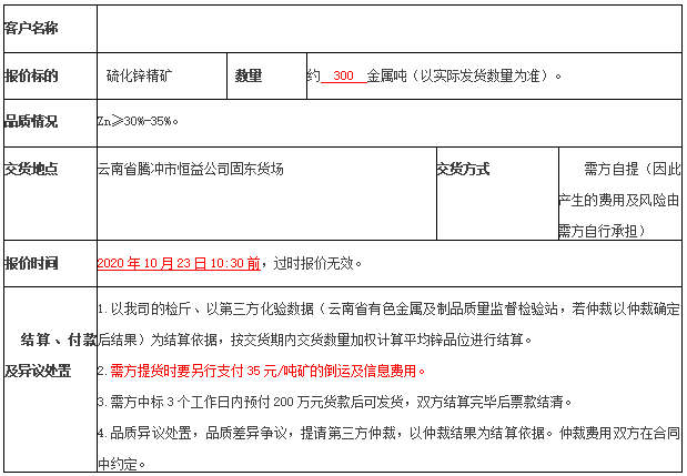 附件 騰沖市恒益礦產品經貿有限責任公司 鋅精礦銷售報價單