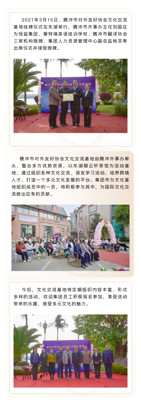 恒益集團掛牌“騰沖市對外友好協(xié)會文化交流基地” 來源: 瀏覽量:6806 日期:2021-03-16 分享到: 上一篇:爛刺溝尾礦庫驗收公示內容 下一篇:“東山之下,原創(chuàng)詩歌、散文分享會”在東山書院隆重舉行
