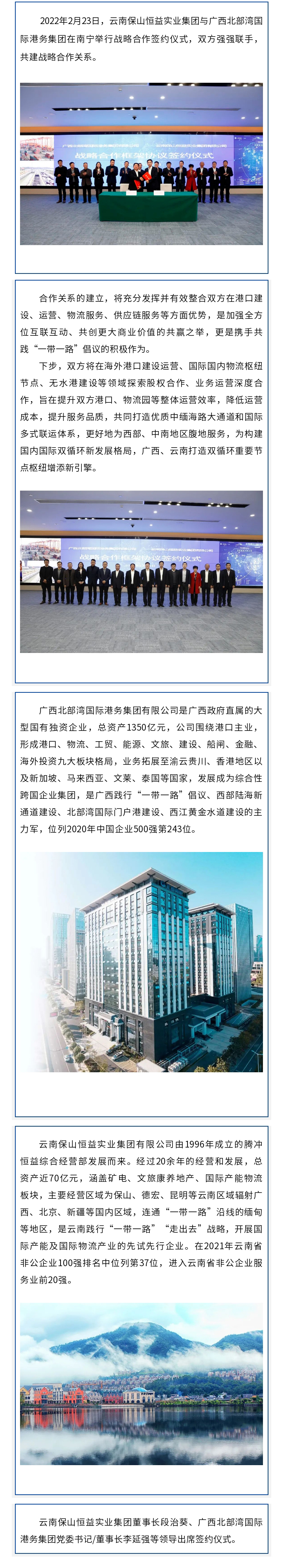 云南保山恒益實(shí)業(yè)集團(tuán)與廣西北部灣國際港務(wù)集團(tuán)簽訂戰(zhàn)略合作協(xié)議 來源: 瀏覽量:6040 日期:2022-02-24 分享到: 上一篇:校企合作,共推溫泉康養(yǎng)產(chǎn)業(yè)發(fā)展 下一篇:恒益集團(tuán)第二屆董事會(huì)第四次會(huì)議舉行