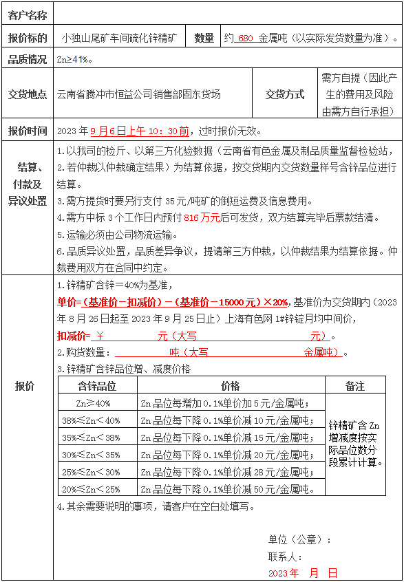 注:1.包裝:散裝。 2.鋅精礦綜合品質(zhì):Zn≥41%。二、收款及結(jié)算方式:詳見報(bào)價(jià)表。