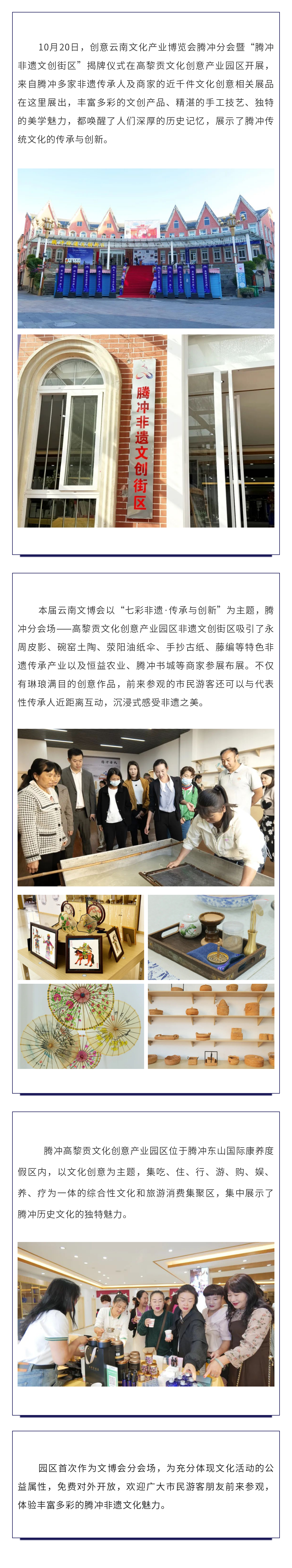 云南文博會(huì),高黎貢文化創(chuàng)意產(chǎn)業(yè)園區(qū)展現(xiàn)騰沖多彩非遺文化 來源: 瀏覽量:4192 日期:2023-10-20 分享到: 上一篇:保山市綠色生物醫(yī)藥產(chǎn)業(yè)鏈群專班蒞臨恒益農(nóng)業(yè)食品加工園調(diào)研 下一篇:直播預(yù)熱丨文博會(huì)分會(huì)場(chǎng),相約騰沖高黎貢文化創(chuàng)意產(chǎn)業(yè)園區(qū)