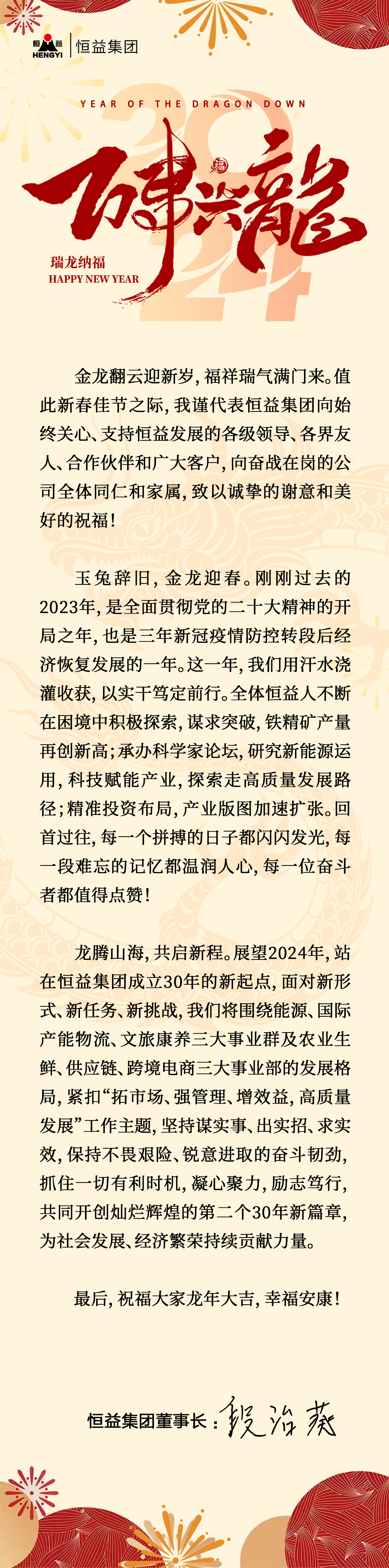 恒益集團(tuán)2024年新春賀詞 來(lái)源: 瀏覽量:4319 日期:2024-02-09 分享到: 上一篇:龍騰盛世,共舞新春丨恒益集團(tuán)受邀參加緬甸華僑界龍年新春慶典 下一篇:強(qiáng)強(qiáng)聯(lián)合集聚發(fā)展效能 合作共贏助力產(chǎn)業(yè)騰飛
