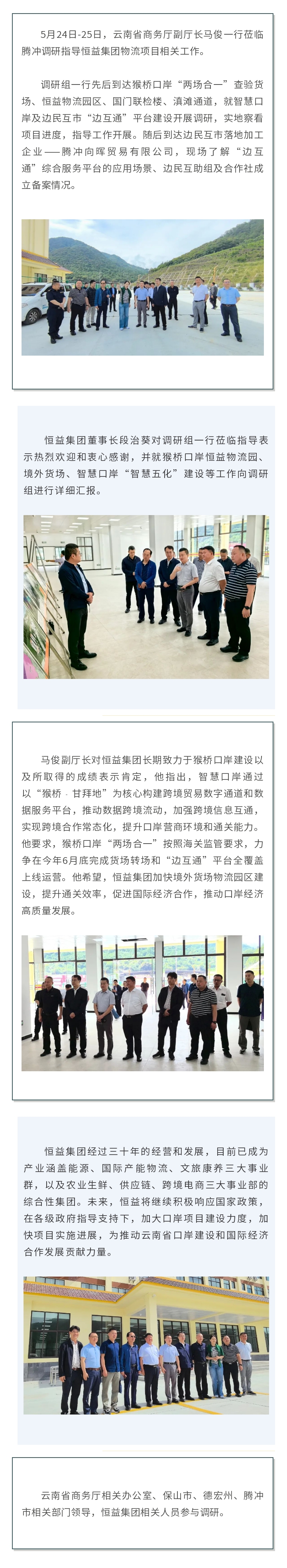 云南省商務(wù)廳副廳長馬俊一行蒞臨恒益集團物流項目調(diào)研指導 來源: 瀏覽量:4413 日期:2024-05-27 分享到: 上一篇:恒益集團受邀參加云南省商務(wù)廳與老撾國家工商會代表團會議 下一篇:恒益集團分別與武昆股份、精谷農(nóng)業(yè)簽署合作協(xié)議