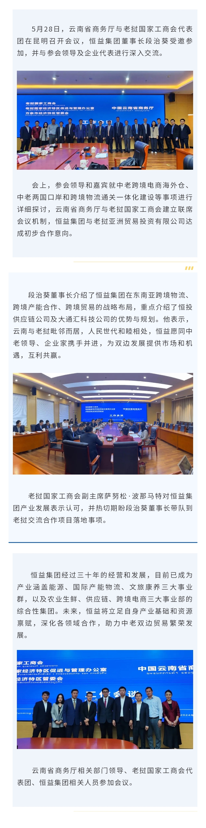 恒益集團受邀參加云南省商務(wù)廳與老撾國家工商會代表團會議 來源: 瀏覽量:3997 日期:2024-05-29 分享到: 上一篇:恒益集團組織開展采購招標管理培訓(xùn) 下一篇:云南省商務(wù)廳副廳長馬俊一行蒞臨恒益集團物流項目調(diào)研指導(dǎo)