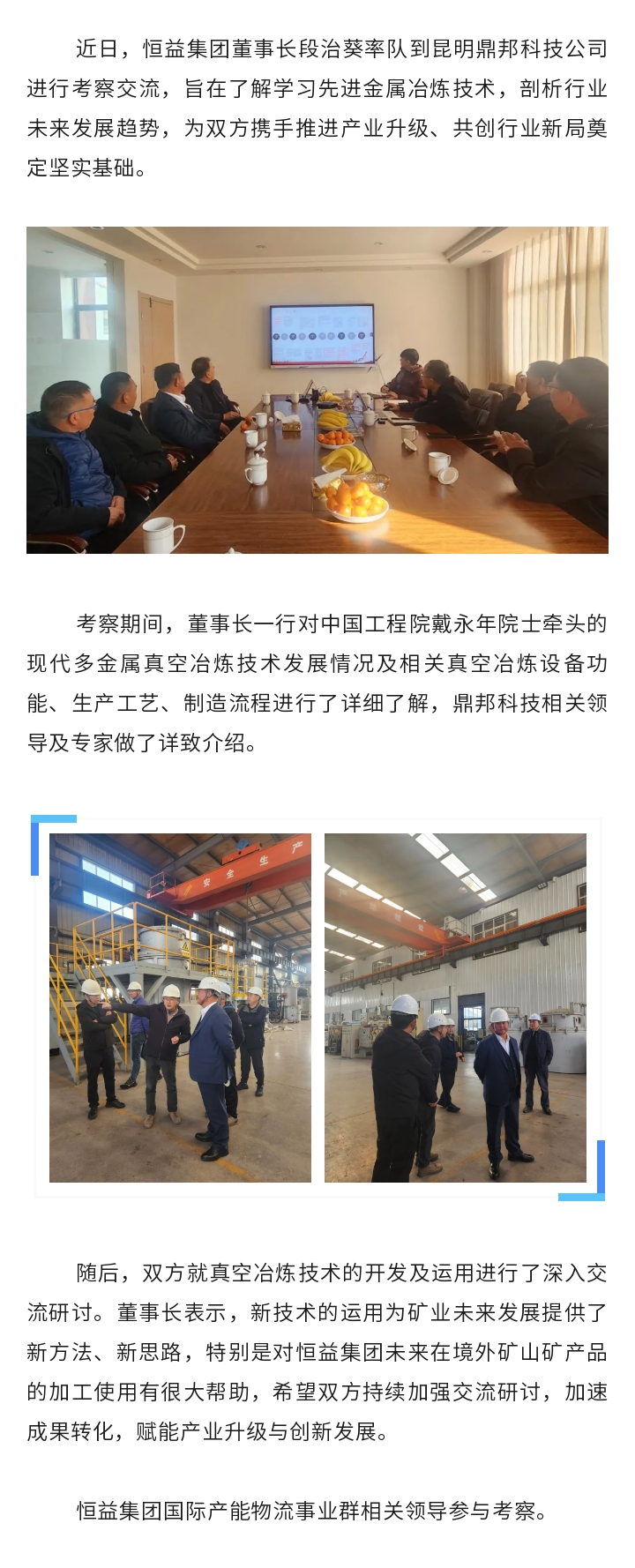 恒益集團(tuán)董事長段治葵率隊(duì)到昆明鼎邦科技公司考察交流 來源: 瀏覽量:3870 日期:2025-01-23 分享到: 上一篇:恒益集團(tuán)召開2025年產(chǎn)業(yè)創(chuàng)新目標(biāo)及任務(wù)分解工作指導(dǎo)會(huì) 下一篇:拓市場,強(qiáng)管理,增效益,高質(zhì)量發(fā)展——恒益集團(tuán)組織召開第三屆董事會(huì)第二次會(huì)議暨2024年度工作會(huì)議