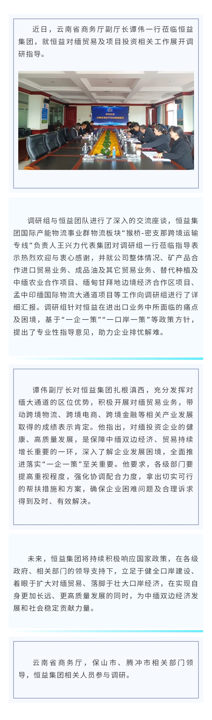 云南省商務(wù)廳副廳長(zhǎng)譚偉一行蒞臨恒益集團(tuán)調(diào)研指導(dǎo) 來源: 瀏覽量:3738 日期:2025-02-24 分享到: 上一篇:騰沖召開領(lǐng)導(dǎo)干部掛鉤服務(wù)企業(yè)專題會(huì) 下一篇:恒益集團(tuán)召開2025年產(chǎn)業(yè)創(chuàng)新目標(biāo)及任務(wù)分解工作指導(dǎo)會(huì)