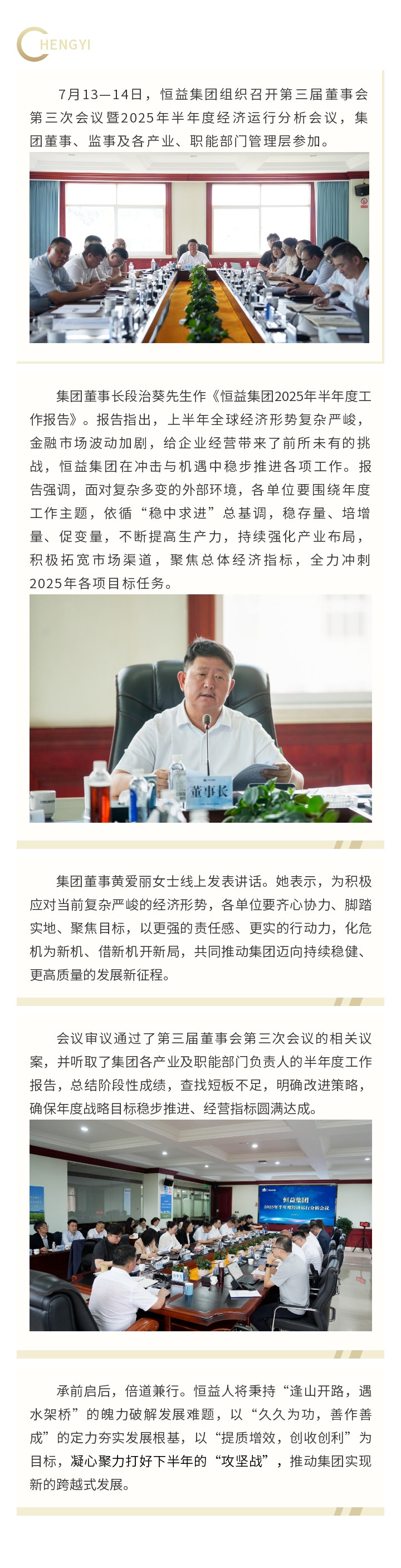 恒益集團(tuán)召開(kāi)第三屆董事會(huì)第三次會(huì)議暨2025年半年度經(jīng)濟(jì)運(yùn)行分析會(huì)議 來(lái)源: 瀏覽量:1645 日期:2025-07-14 分享到: 上一篇:恒益集團(tuán)2025屆“益幟力”管培生集訓(xùn)開(kāi)營(yíng)啦! 下一篇:北緯25°的清涼約定~騰沖東山草原·云端19℃夏