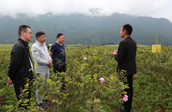 6月3日,調(diào)研組一行在恒益集團(tuán)總裁彭良波、董事朱旭東及相關(guān)高管的陪同下,對(duì)恒益大馬士革玫瑰項(xiàng)目進(jìn)行實(shí)地調(diào)研參觀,先后到達(dá)了大馬士革玫瑰明光種植基地、玫瑰觀光莊園、固?hào)|玫瑰品種資源科普基地、玫瑰臨時(shí)加工車間。期間,露絲福公司總經(jīng)理彭文濤就大馬士革玫瑰項(xiàng)目建設(shè)情況、下步發(fā)展定位及產(chǎn)業(yè)規(guī)劃作了詳細(xì)匯報(bào)。針對(duì)產(chǎn)業(yè)下步發(fā)展方向、產(chǎn)品開發(fā)、一二三產(chǎn)業(yè)融合等,羅軍書記與彭良波總裁、彭文濤總經(jīng)理進(jìn)行了深入溝通。同時(shí),彭良波總裁就玫瑰項(xiàng)目所帶來的精準(zhǔn)扶貧、農(nóng)民增收、經(jīng)濟(jì)效益方面也作了深入分析。