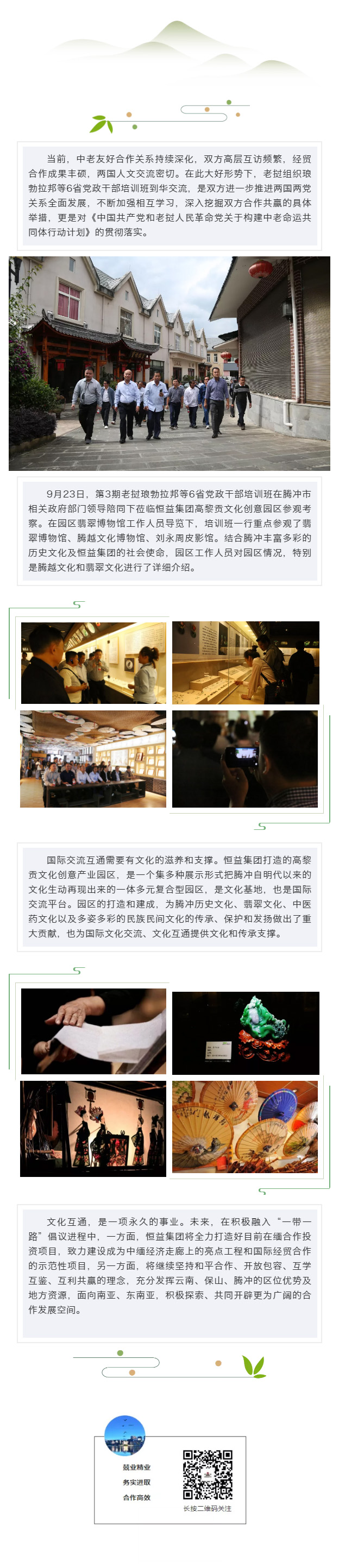第3期老撾瑯勃拉邦等6省黨政干部培訓(xùn)班蒞臨高黎貢文化創(chuàng)意園區(qū)參觀考察 來源: 瀏覽量:8113 日期:2019-09-24 分享到: 上一篇:騰沖市副市長(zhǎng)李屏一行蒞臨恒益健康體檢中心調(diào)研指導(dǎo) 下一篇:商務(wù)部紀(jì)檢監(jiān)察穩(wěn)外貿(mào)調(diào)研組蒞臨恒益集團(tuán)調(diào)研