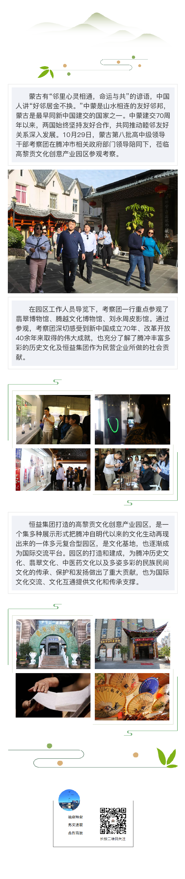 蒙古第八批高中級領(lǐng)導(dǎo)干部考察團(tuán)蒞臨高黎貢文化創(chuàng)意產(chǎn)業(yè)園區(qū)參觀考察 來源: 瀏覽量:7736 日期:2019-10-29 分享到: 上一篇:國家發(fā)改委價格認(rèn)證中心第四期培訓(xùn)會成員參觀考察騰沖翡翠博物館 下一篇:恒益集團(tuán)第三屆籃球賽揭開戰(zhàn)幕