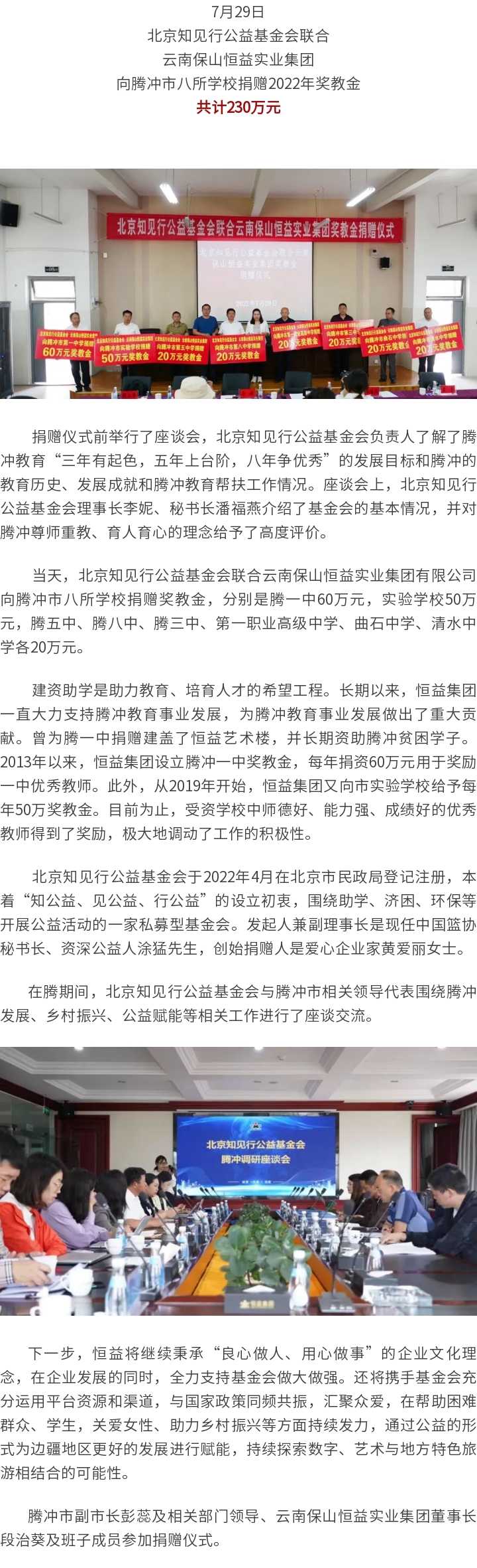 知見行公益基金會(huì)聯(lián)合恒益集團(tuán)向騰沖市八所學(xué)校捐贈(zèng)230萬元獎(jiǎng)教金 來源: 瀏覽量:5807 日期:2022-08-02 分享到: 上一篇:喜訊│恒益集團(tuán)榮獲捐資助學(xué)、尊師重教先進(jìn)集體(個(gè)人) 下一篇:恒益集團(tuán)第二屆董事會(huì)第五次會(huì)議暨2022年半年度經(jīng)濟(jì)運(yùn)行分析會(huì)議圓滿舉行