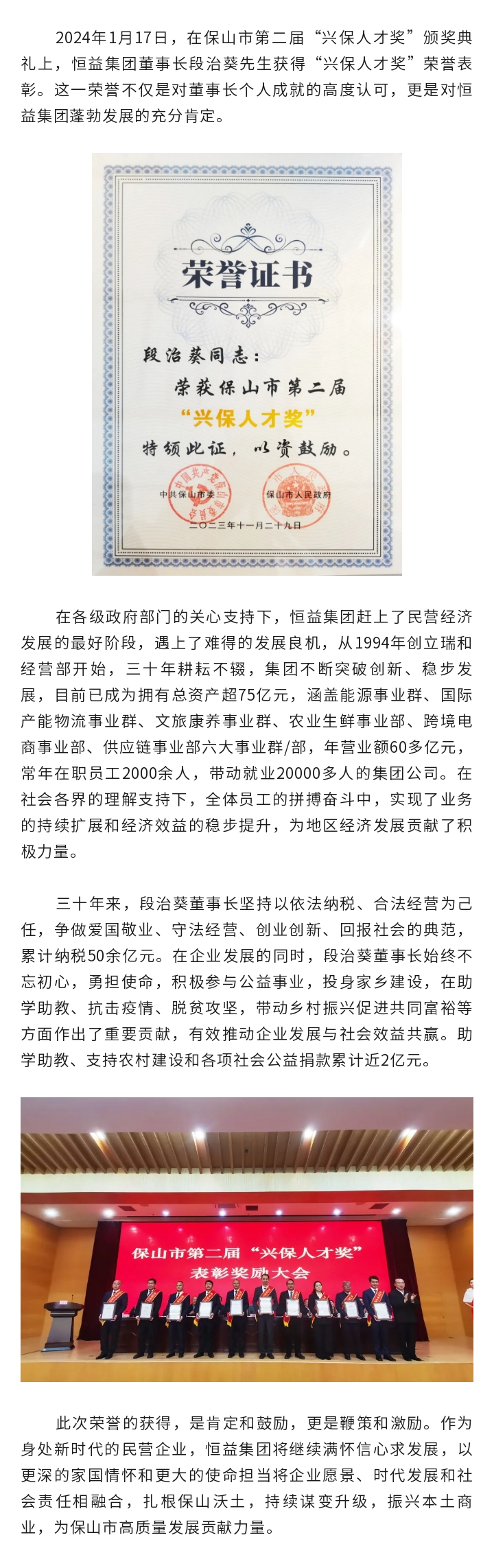 喜訊丨恒益集團(tuán)董事長段治葵獲保山市第二屆“興保人才獎”榮譽(yù)表彰 來源: 瀏覽量:4978 日期:2024-01-17 分享到: 上一篇:恒益集團(tuán)攜手北京知見行公益基金會為瑞麗地區(qū)教育事業(yè)捐贈100萬元 下一篇:揚(yáng)帆正當(dāng)時 逐潮擊浪高——記保山市第二屆“興保人才獎”獲獎?wù)叨沃慰?/a>