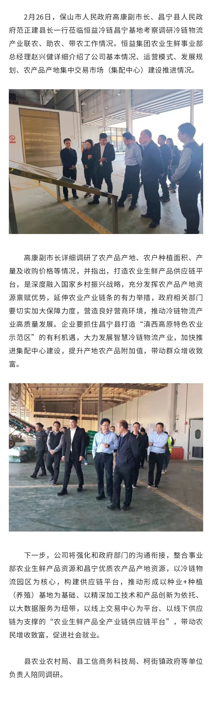 加快打造農(nóng)業(yè)生鮮產(chǎn)品供應(yīng)鏈平臺 帶動群眾增收致富 來源: 瀏覽量:4136 日期:2024-02-27 分享到: 上一篇:馬子興到恒益集團召開騰沖市服務(wù)企業(yè)推進項目建設(shè)座談會 下一篇:龍騰盛世,共舞新春丨恒益集團受邀參加緬甸華僑界龍年新春慶典