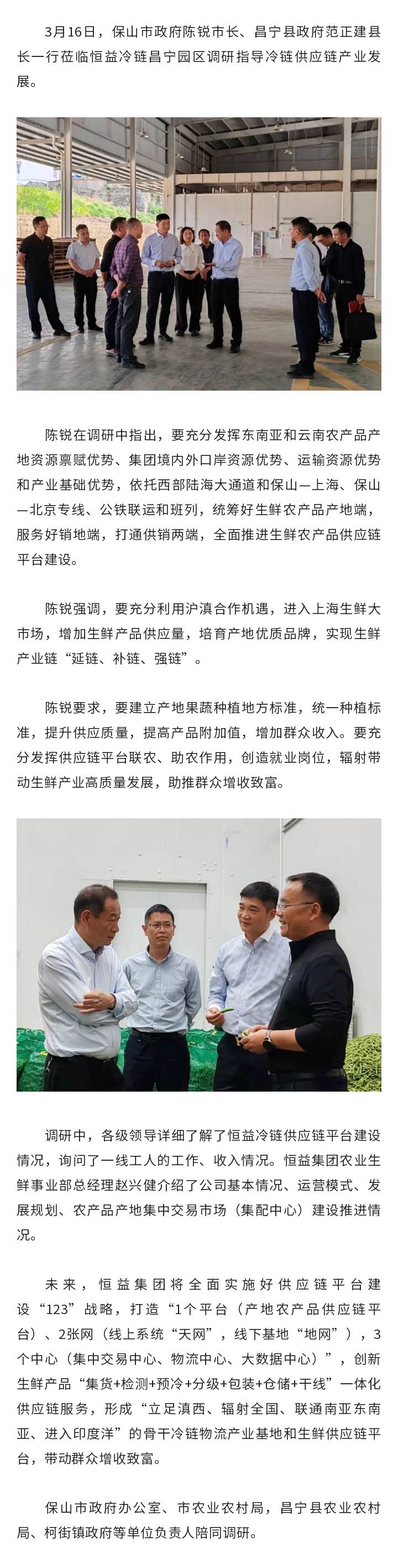 保山市政府主要領(lǐng)導(dǎo)蒞臨昌寧冷鏈物流園區(qū)調(diào)研指導(dǎo)工作 來(lái)源: 瀏覽量:4083 日期:2024-03-18 分享到: 上一篇:2024騰沖科學(xué)家論壇——“地?zé)豳Y源與溫泉醫(yī)康養(yǎng)產(chǎn)業(yè)發(fā)展”院士講壇成功舉辦 下一篇:“共建西部陸海大通道,共享南向開(kāi)放新機(jī)遇”交流活動(dòng)成功舉辦