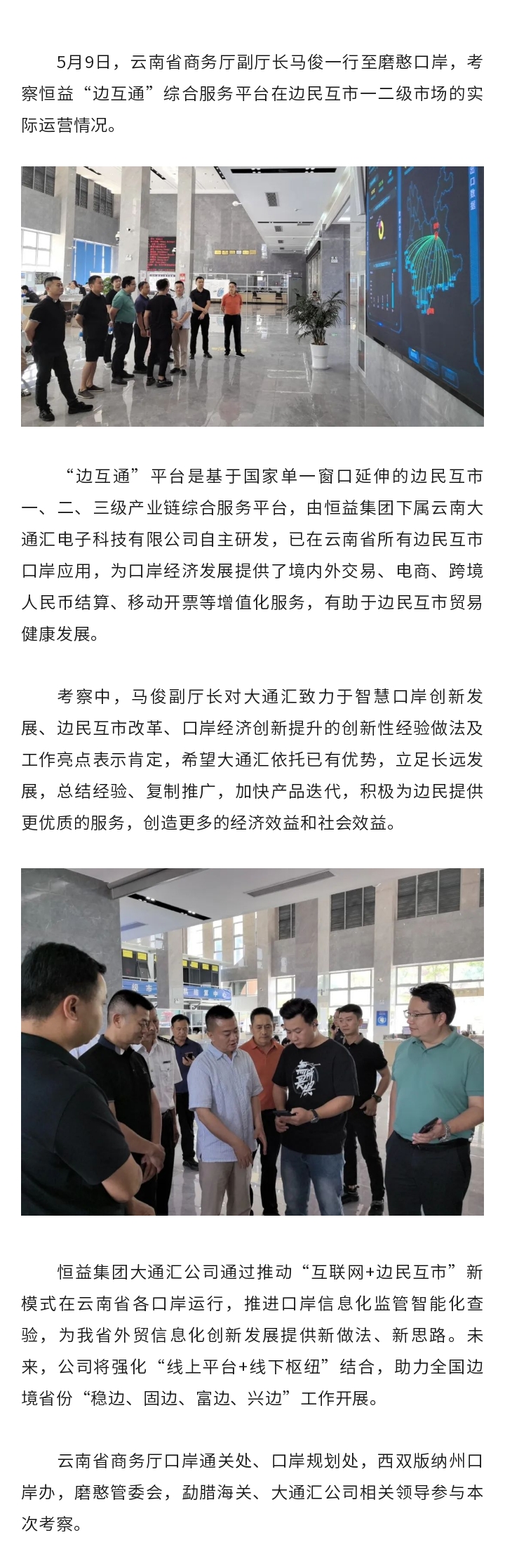 云南省商務(wù)廳副廳長一行赴磨憨考察恒益“邊互通”綜合服務(wù)平臺實際運營 來源: 瀏覽量:4018 日期:2024-05-11 分享到: 上一篇:“知見行杯·奔跑吧少年”2024年騰沖市第七屆小學(xué)生校園籃球聯(lián)賽圓滿落幕 下一篇:五一假期咋個耍?東山草原活動來襲