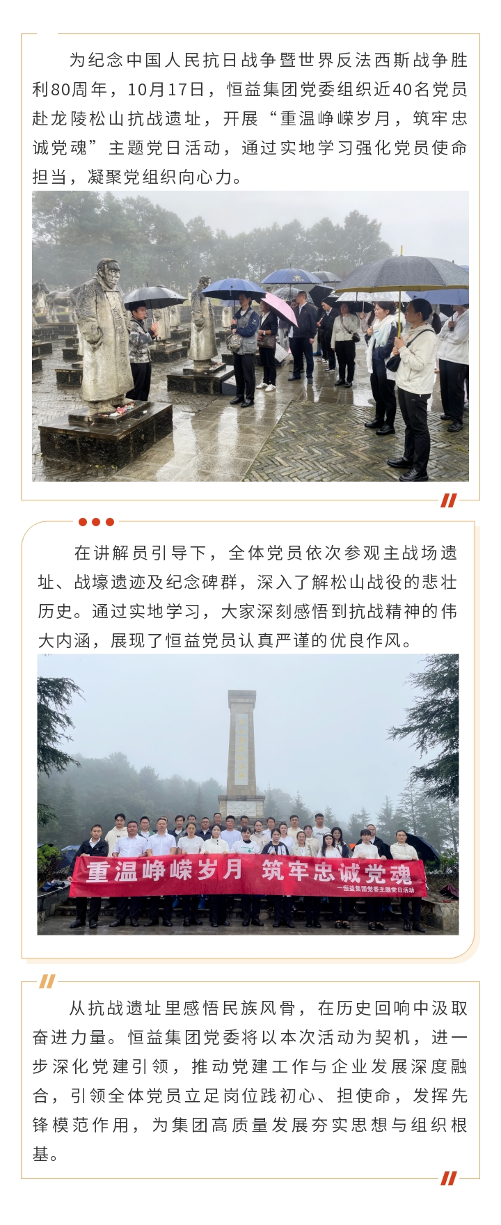 恒益集團(tuán)黨委赴松山抗戰(zhàn)遺址開(kāi)展主題黨日活動(dòng) 來(lái)源: 瀏覽量:777 日期:2025-10-17 分享到: 上一篇:共筑康養(yǎng)新未來(lái) | 恒益集團(tuán)與古兜控股強(qiáng)強(qiáng)聯(lián)手,簽署戰(zhàn)略合作協(xié)議 下一篇:恒益集團(tuán)開(kāi)展高管刑事法律風(fēng)險(xiǎn)防范與合規(guī)體系建設(shè)專項(xiàng)培訓(xùn)